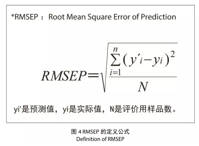 比較后可知,兩種方法的定量精度并無明顯差異,說明定量結果良好。表 3 的RMSEP 是圖 4 中定義的值,表示預測值與實際值平均差的指標。